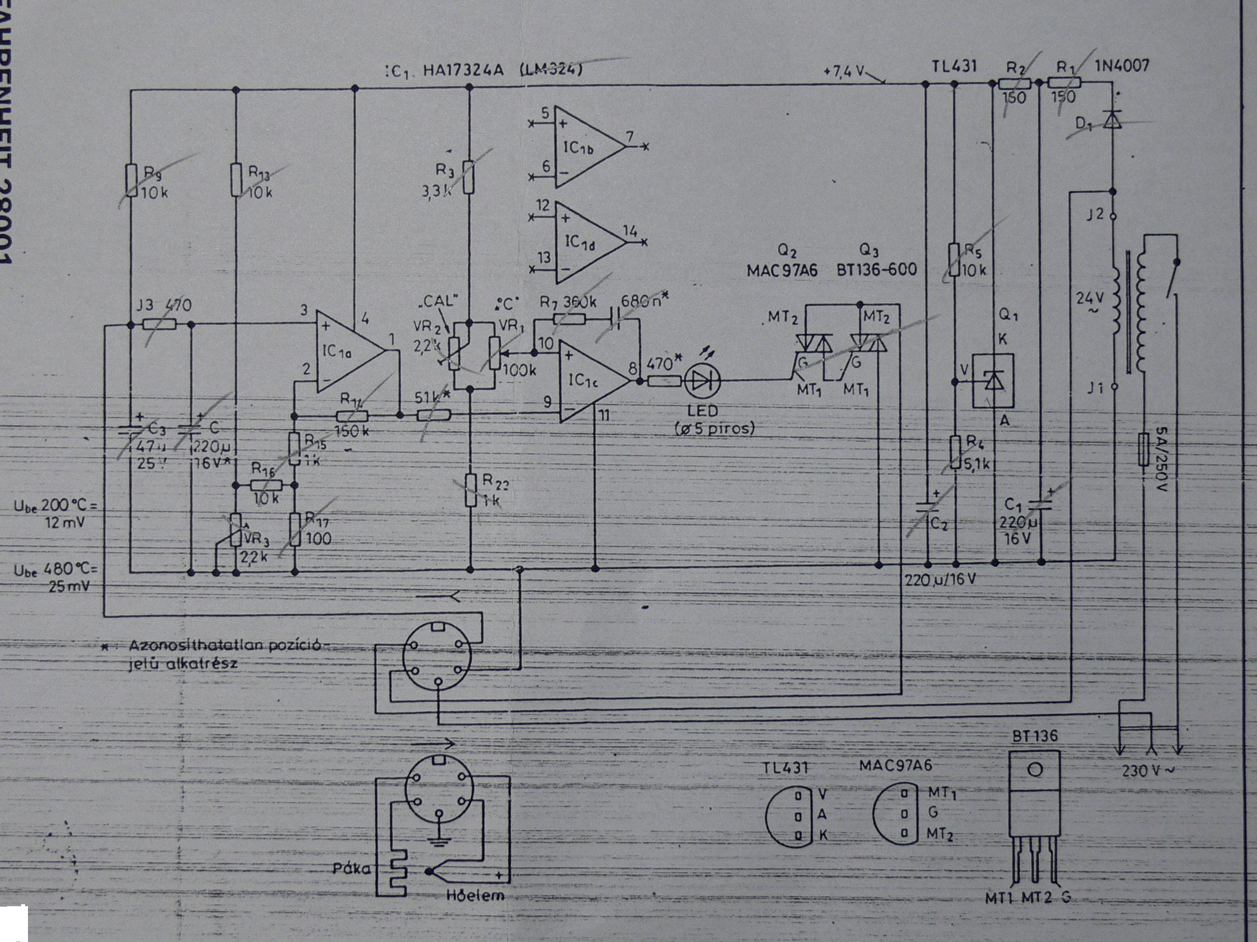 Vegyél egy JLT-02-es pákát. itt sokan olyanal csinálták ezt a szabályzót. A másodikat. Ha még kezdő vagy akkor böven elég lesz ez a páka. Küldök doksit ha kell amit Maserfox készitett. Nagyon kis profi szabályzót tudsz belőlle csinálni. Az IC tartalmaz 4 müveleti erőssítőt. De ez egy tokban van benne. nekünk eből csak kettő kell. a töbit nem kötjök sehova. De ha figyelmesen megnézed látod hogy a bemenetek meg vannak számozva. 14-ig. ebből levonhatod a következtetést hogy hogy ez egy 14 lábas IC. A müveleti erősitők pedig azért vannak megbetüzve hogy tudjuk melyik kell. A höelem pedig egy olyan fémcucc a páka végében ami kis feszt ad ki magábol. ez változik a hömérséklet hatására. Ez a fesz fogja szabályozni a müveleti erősitőn keresztül a triakkot. Azt zárja vagy nyitja attol függöen hogy kell e füteni a pákát vagy nem. Vagyis ha egy bizonyos hömérséklet kell akkor a triak kinyit a pákát felmelegiti az áram. Nö a jöelem feszültsége és ha eléri a beálított pontot akkor kikapcsolja a triakot. Ha viszahül a páka akkor a höelemnek a fesze leesik és az IC bekapcsolja a triakot. ujra felfüti. Igy játszik vele ameddig akarod. Nem egy drága kapcsolás, jól türte ha kicsit más triakot tettem bele is. mentem aludni. Isa szerkesztve: na megelöztek