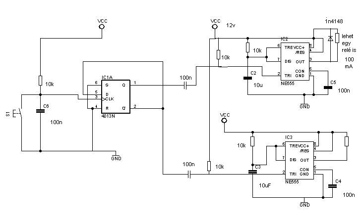 Itt is lenne az első kis kapcsolás, gombnyomásra kellene a Ki1 és Ki2 kijáraton kb 1másodperces pozitív szintnek lennie felváltva. Tehát, egy gombnyomás=Ki1 1másodperc pozitív, mégegy gombnyomás=Ki2 1másodperc pozitív, és így tovább. Egy monostabil és két bistabil kapcsolásból szerintem megépíthető... ha valakinek van jobb ötlete, vagy hibát talál ezen, kérem jelezze.