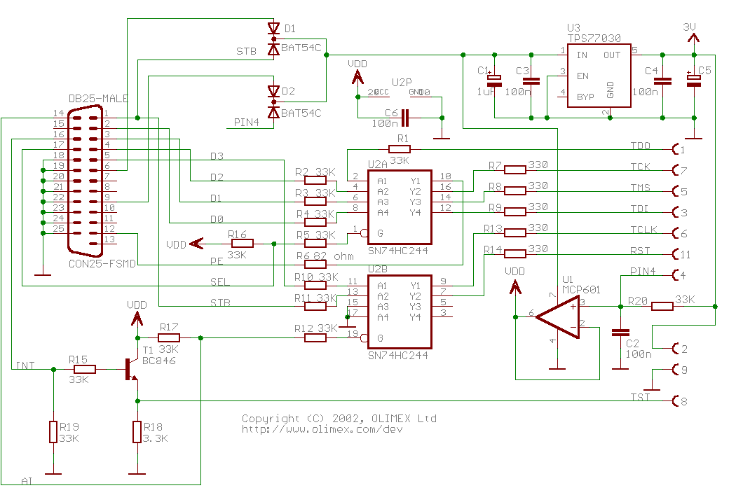 Egy hasonló JTAG programozó kapcsolásom lenne, mint Igyk-nak. Az lenne a kérdésem, hogy a jobb tetején lévő 3Vos feszforrás az megegyezik-e a több helyen előforduló Vdd-kel. Valószínűleg ez valami alapvető dolog annak aki már jártasabb az ilyen tervezőprogramokban, de én még eddig ilyet nem igazán láttam. Másik amit nem értek, hogy ezt a feszültséget hol csatlakoztatják rá, ha olyan szerelésben csinálják, amilyet csatoltam képen. Eleve azt írják, hogy ennek külső fesz nélkül fel kéne tudnia programozni a uC-t, mert elég az amit az LPT portról levesz. A kapcsolást az Olimex tette közzé egyébként, az oldalukon van részletesebb infó róla: Bővebben: Link