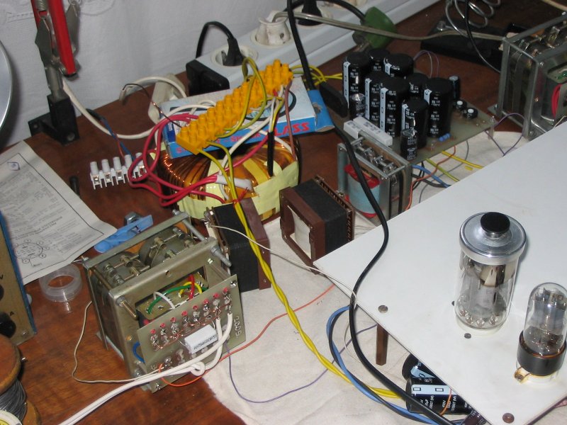 Míg várok az asztalosra, hogy elkészüljön a doboz, összeállítottam az íróasztalon a GU 50 Se-t. Türelmetlen ember lévén, semmi méricskélés, próba élesben. Nagyon pici brümm a káosz ellenére. Szóval: nekem tetszik a hangja ! Megérte a gyötrelem a kimenőkkel + a toroidot is én tekertem kézzel. Egy valamit viszont nem értek. Olyan -70 , -80 V előfeszültség hatására áll be az anódáram 60 mA -re. Nem sok ez ? A GU triódának van kötve, anód feszültség 430V, GU fűtőfeszültsége 13,1 V ,230 V hálózati feszültségnél.