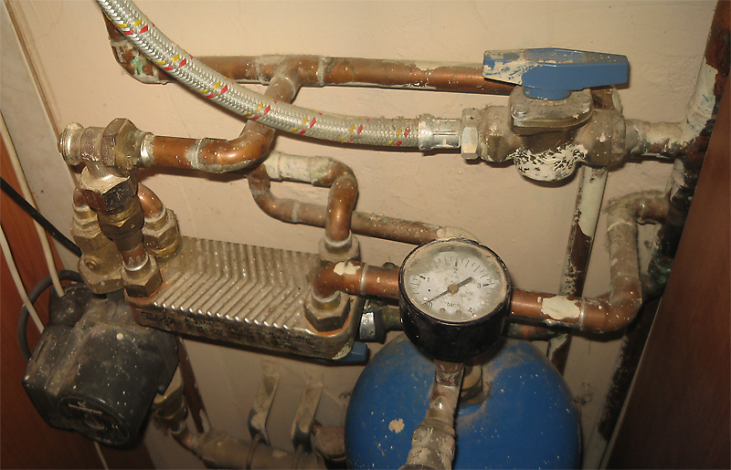 Ha jól betonozták a padlófűtást, akkor a csövekben most is víznek kell lennie, ugyanis, a betonozás előtt nyomás alá kell helyezni a csöveket, hogy nem lukas e valahol. És sokkal jobb nyomás alatt, - tehát vizzel feltöltve ,- betonozni, mert sokkal jobban bírja a cső a gyűrődést, mert a betonnal teli talicskát simán áttolják rajta. A kék tartály nekem kicsit furcsa, ha jól emlékszem, a fűtéshez pirosat szoktak használni, - ez kevésbé bírja a nyomást, meg olcsóbb is. A fehér meg tágulási tartály a melegvízhez. De attól még lehet ez is jó. Valahol, az alján szokott lenni egy nagy lapos műanyag fedő, ezt tekerd le, alatta van egy szelep és autóspumpával fel tudod fújni. Legyen benne mondjuk egy bár nyomás. Ezt nyomásmérővel kell ellenőrizni. Az a nyomásmérő, ami most nullán áll, nem ezt a nyomást méri, hanem az adott vízkör nyomását. ( A tágulási tartály két részből áll, egymástól egy gumimembrán-szerűséggel elválasztva. Amit fel kell pumpálni, azon nincs nyomásmérő, hanem azt a szelepre kell csatlakoztatni.) Az osztó-gyűjtő valahol rá van kötve a vízhálózatra. Óvatosan nyisd meg a csapot, hogy a vízhálózatból menjen be víz a padlófűtéscsövekbe. Lehet, hogy akár 5...10 liter víz is hiányzik belőle. ( Már ha fel volt töltve a betonozás előtt. Ha feltöltötték, akkor benne is kell hogy legyen a víz, mert azt már elég körülményes onnan kiszedni... ) Természetesen, az osztó-gyűjtőn legyen az összes csap nyitva. Ha már tele van, akkor fogod látni, hogy a nyomásmérő ( ami be van építve ) elkezd mutatni. Közben, a légtelenítő szelepek kicsit fütyülhetnek, mert jön ki a csövekből a levegő. Ezeknek a tetején van egy csavar, az legyen jól meglazítva és a későbbiekben is legyen így. Addig engedd bele a vizet, míg egy bár nem lesz a nyomás. Ez azt jelenti, hogy a tágulási tartályban a gumimembrán középen van. Ha elkezd a rendszer fűteni, akkor a víz tágulni fog és a gumimembrán kezdi csökkenteni annak a tartályrésznek a térfogatát, amit az előzőekben felpumpáltál egy bárra. Tehát, egy kicsit nőni fog a nyomás, mondjuk 1,2 bár lesz 40 fokon. Ez elvileg jó, akkor már megy is a fűtés. A padlófűtésbe nyilván nem szabad akármilyen hőmérsékletű vizet belengedni, legyen ez maximum 50 fok. ( Bár a mostani csövek ennél sokkal nagyobbat is kibírna, de a beton, meg a burkolat, meg különösen a csemperagasztó már nem nagyon. Szóval, ha ennél melegebb víz akarna bemenni a csövekbe, akkor le kell állítani a szivattyút. A szivattyúnak,- ha többsebességes,- akkor állíthatod a vízhozamát. Nyilván, kis fordulaton melegebb víz fog bemenni a csövekbe, mert a a hőcserélőről lassabban viszi el a hőenergiát. Nagy fordulaton, meg úgy tűnik, mintha kicsi lenne a hőcserélő, mert a nagy vízsebesség miatt nem tud felmelegedni eléggé a víz. A végeredmény egy felfűtött helyiségnél az lenne, hogy nagyon meleg van bent, az előremenő és visszajövő vízhőmérséklet alig különbözik. Tehát, mindenképpen kell valami ami leállítja a szivattyút, talán lehetne egy csőtermosztát, ez egy olyan szerkezet, amit az előremenő vízcsőre kell szerelni, van rajta egy kapcsoló és ha eléri a víz a beállított hőmérsékletet, akkor a kapcsoló kapcsol és mondjuk kikapcsolja a szivattyú tápellátásást. Ekkor, a hőcserélőn nem jön át több hőenergia, hiszen a víz áll a padlófűtés oldalon. ( szerintem, nem kell bele az a motoros szelep, megy anélkül is, de ha már ott van, akkor az is elzárhat a csőtermosztátra. Egyébként, ezt helyiségek fűtésénel leválasztására használják, pl vagy csak a földszintet fűtse a kazán, vagy a tetőteret is, tehát ilyesmire. Nézd meg valahogy, ha ez a szelep nyitva van, akkor nincs gond, nem kell rá a "motor" sem. Mielőtt bármit veszel, próbáld ki az egészet úgy, ahogy leírtam. Itt még nagyon sok minden van amit figyelembe kell venni, de a fentiek már elegek ahhoz, hogy fűteni lehessen vele.