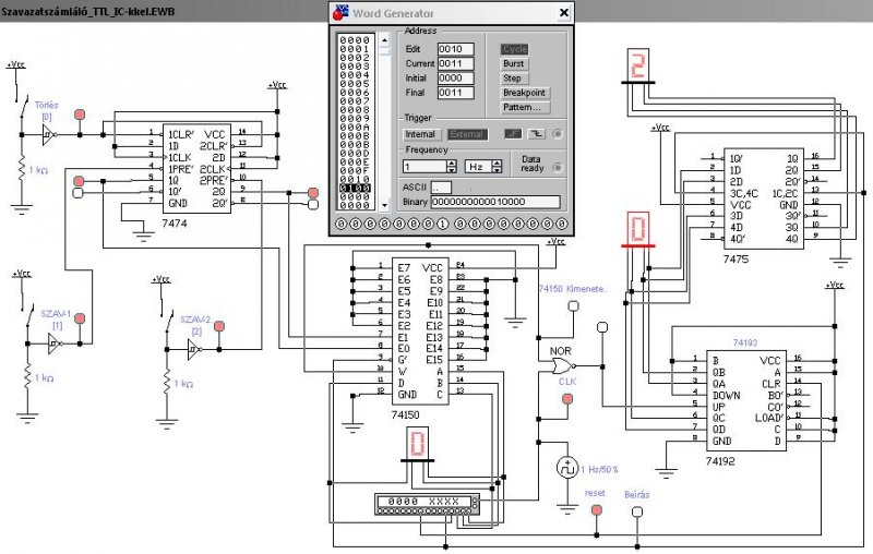 A 74150-et ciklikusan kellene megcímezni az A,B,C,D bemeneteit. A 74150-es vezérlésére egy bináris számláló lehetne a legalkalmasabb. PL 74193-mat. Így egy-egy gombról meg lehet állapítani hogy aktív volt-e. Az alapórajellel szinkronban egy másik számlálóval "számolni kell" az aktív gombokat. ( Ki kell kapuzni a 74150-es kimenetét és az órajelet. ) Így megszámlált szavazatok már "névtelenek". A számláló tartalmát egy tárolóban kell megőrizni, hogy a számláló közbelső értékei ne jelenjen meg. A tároló kimenetén bináris (hexadecimális) érték lesz. Azért hogy könnyen olvasható legyen, a BINÁRIS (HEXA) formát DECIMÁLIS-ra kell konvertálni és úgy megjeleníteni. Konvertálásra pl a 74185 is megfelelne. S kijelzésre a 7447-est...