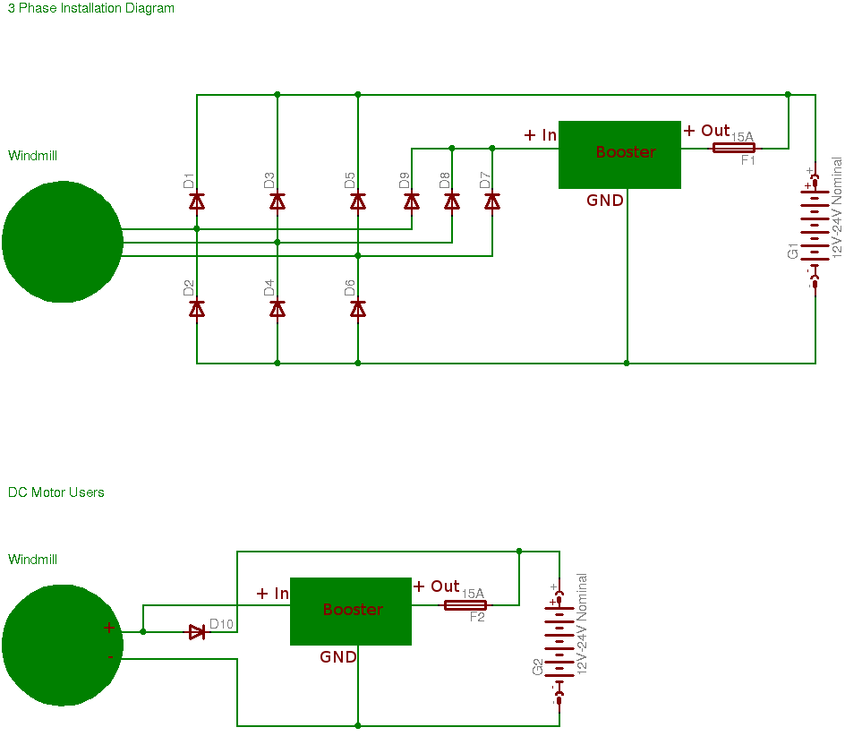 12V-ból 24-et csinál, ezzel 24V-os akkupakk tölthető kisebb feszültséggel. A mellékletben lévő ajánlott kapcsolással azt érhetjük el, hogy amíg a szélgenerátor nem éri el a 24Vot, addig a boosterről tölti az akkut. Amikor túllépi a szélgenerátor a 24V-ot, a boostert megkerülve közvetlenül tölti az akksit. Így kisebb fordulaton is tölt a generátor, szélesebb a működési tartomány. Szerintem ez jó ötlet, én is megcsinálom.