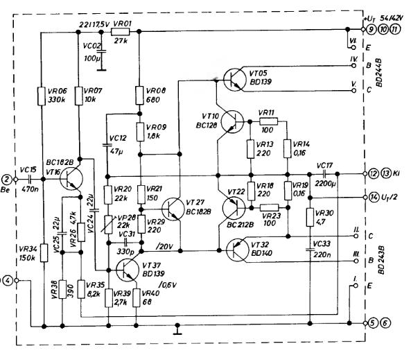 Így ránézésre, nem túl jó ötlet ezt a kapcsolást újraépíteni. Ha mégis, annak egy oka lehet: A múlt tisztelete, egy retro erősítő helyreállításával. A következő problémákat látom: - a rajz szerintem nem jó. A BD244B Collektorát össze kelle kötni VR11 és VR14 közös pontjával. Ez is valami Gyurkovics könyvből van ? - a 0,47 kOhm nagyon nem jó érték, hiszen az 470 Ohm. A 0,47 Ohm egy jó érték lenne, de akkor a kapcsolás kb. 1/3-ad akkora teljesítmény leadására képes csak, mint a 0,16-al. Viszont lehet, hogy éppen a 0,16 Ohm-ot kellene lecserélni 0,47 Ohm-ra, és akkor nem égne le az erőlködő. - szerencsés lenne a BD244B emittere és bázisa közé kötni egy egy pár száz Ohm-os Ellenállást (470-680 Ohm). ...És természetesen ugyan így a BD243B B-E közé is. - a VP28-al a 14-es kivezetésen kell beállítani pontosan a tápfeszültség felét. Tehát, ha a tápfeszültséged megmérve mondjuk 52V, akkor a 14-es kivezetésen 26V-ot kell beállítani a VP28-al. - szerencsés lenne a VR29-et kicserélni egy 470 Ohm-os trimmer potméterre. Ezze lehet beállítani a nyugalmi áramot, ami valahol 20-100 mA között jó. Vigyázat!!! A trimmert, bekapcsolás előtt, maximális állsba kell tekerni (hogy 470 Ohm legyen a két kivezetése között, mert különben az erőszítő azonnal elszállhat.) Ez a 470 Ohm-ot folyamatosan csökkenteve lehet növelni a nyugalmi áramot.