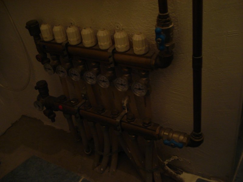 Ettől több képet nem akartam (akarok) felrakni. A képeken jól látszik minden. Hét kör radiátorból, és hét a padlófűtésből. A pf. 20kW-os hőcserélővel le van választva a radiátoros körtől (a fehér habszivacsos izé). A pf. tökéletesen működik, Kb. egy hétig hasaltam az elosztó előtt, mire beállítottam a köröket, még 2002-ben.