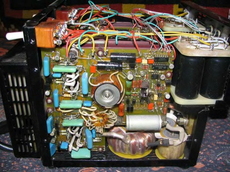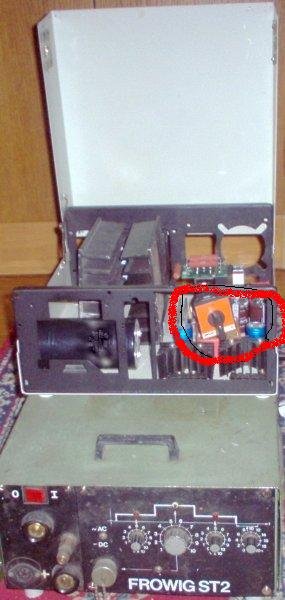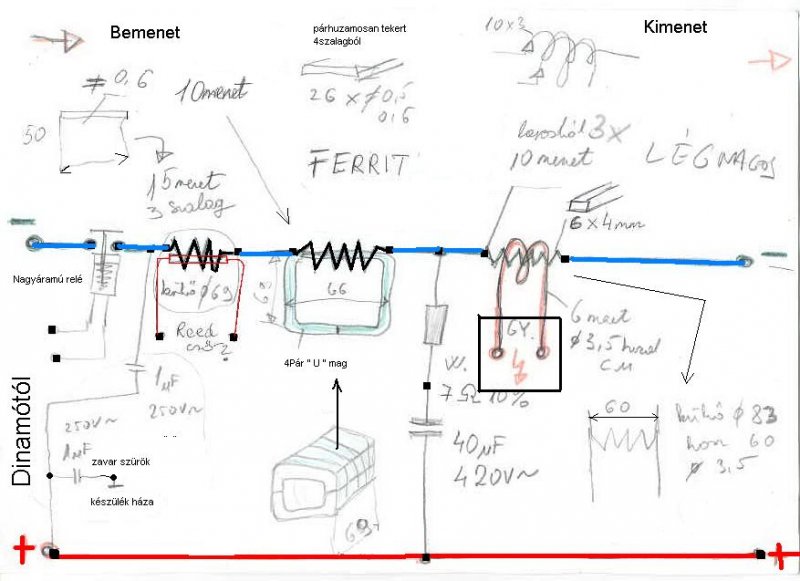 Toroid trafó van benne a primer 22 menet 2,5 átm. CuZ huzal a szeku: 2*4 menet középmegcsapolással 3mm átm. CuZ. A magot csak kb tudtam megmérni mert nem szedtem szét a trafót : átmérő 55mm ,szélesség 25mm belső átm. 25mm. Fojtó tekercs nincs. A gép üresjárati feszültsége 68 V.