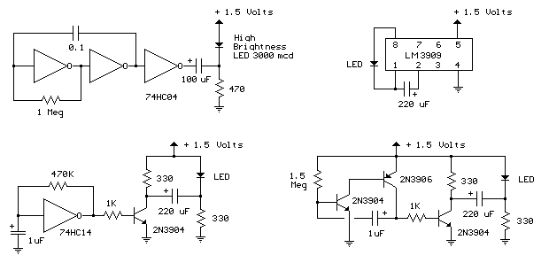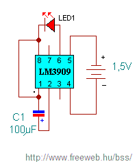 A legegysezrűbb, legkevesebb alkatrészből kihozható az LM3909-es IC-vel összeállított. Ennek elég 1,5V, alig kell a LED-en kívül más bele, és itt is idézték már néhányan.