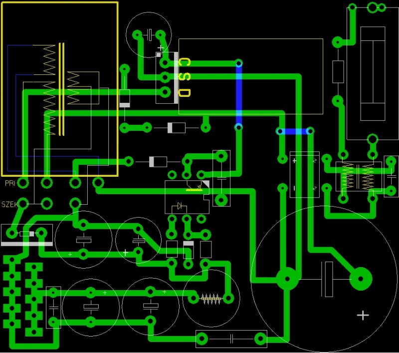 ![]() Amit mutattam nyákrajz azon az opto diódája fordítva van, erre még beültetés előtt rájöttem, de arra nem hogy maga az optó is fordítva van rajzolva. Bekapcsoltam kis izó a végén, és látom hogy elindulna de letilt, elindul letilt. Csak az opto lehetett, megnéztem a körítést (zener, ellenállások) majd az adatlapot és akkor vettem észre a hibát. Átvert mert nem a szokásos módon volt ábrázolva a lábkiosztás, hanem pont visszafelé. Szóval optó meghalt, csere, ezután már tökéletesen ment. Csináltam pár próbát rajta, jelenleg a hosszútávon próbálom ki, hogy biztos nem melegszik-e valami nagyon stb.... már 1 órája megy gond nélkül. Végül is csak 5,1V-os zener volt itthon ezért a kimenő feszültség 6,4V-lett, de a gyertyához pont jó mert 5-9V között kell neki. Egyenlőre leválasztó trafóról megy (képeken a kék tekercses), ezért a mért áramerősség nem tudom mennyire pontos, de így ebben az állapotban 6,4V-on 2,5A-t tud leadni. dudzsi Neked is tudom ajánlani a TOPxxx családot, igaz drága az ic, de ha veszel mellé egy 500ft-os pc tápot, akkor már az összes szükséges alkatrész is megvan hozzá. Egészen 250W-ig lehet használni ezeket az IC-ket, e fölött cimopata tápját ajánlanám.