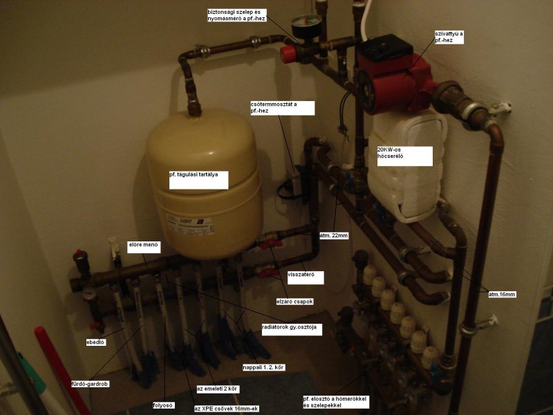 Jól látom, a padlófűtés osztó-gyűjtőre menő csövek csak 16 mm-esek? Nagyobb kellett volna, a szivattyúnak jobban kell dolgoznia. Éppen elég a sok padlófűtés csövön átnyomnia a vizet. Igaz, ott 5 részre ágazik el az a vízmennyiség, ami az előbbi 16-os csövön jön. Ettől még jó lehet, bár ennek a csőnek elég nagy így az ellenállása.