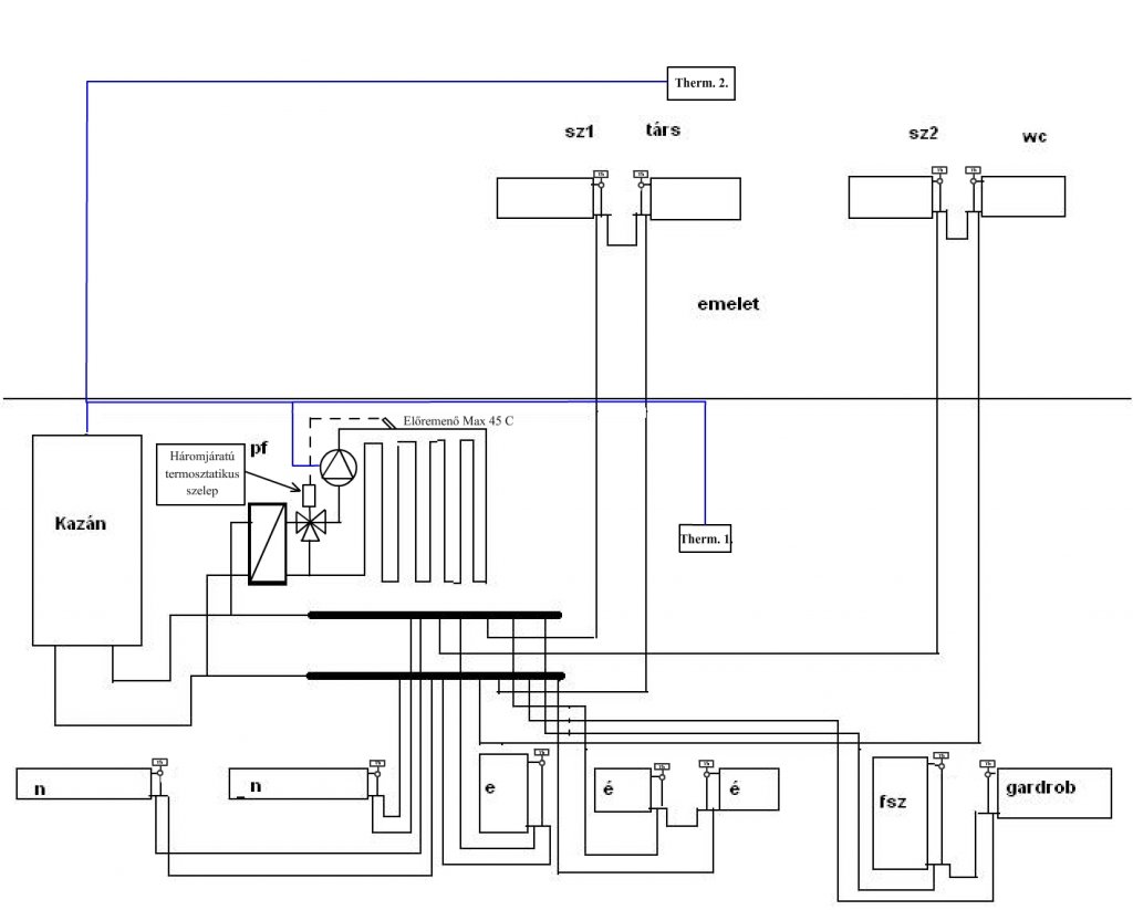 Berajzoltam a rajzodra hogy mit kellene módosítanod a fűtési rendszereden, ahhoz hogy legyen egy elfogadható fűtésed! Először is kellene a padlófűtés körbe egy háromjáratú termosztatikus szelep, mellyel 35 - 45°C kellene beállítani a padlófűtés előremenő hőmérsékletét. Két helyiség termosztát kellene, a Therm1 valamelyik padlófűtéses helyiségbe, a Therm2 a felső szinti radiátoros helyiségbe kellene elhelyezni. A két termosztát külön-külön tudja vezérelni a kazánt(VAGY kapcsolás) plusz még a Therm1-nek külön kellene kapcsolnia a padlófűtés szivattyúját is. Ja és még egy: az összes radiátoron legyen termofej, a kazánhőfok pedig 60°C legyen! A rendszer működése: A Therm1, Therm2 kapcsolok, indítják a kazánt, melynek a 60°C-os előremenő vize megy a radiátorokba és a padlófűtés hőcserélőjébe. A padlófűtés hőcserélő szekunder oldalába beépített háromjáratú termosztatikus szelep bekeveri a 35 - 45°C-os előremenő vízhőmérsékletet a padlófűtésnek. Ha az alsó radiátoros helyiségek valamelyike eléri a kívánt hőmérsékletet, lezár a rajta lévő termofej, de így még a padlófűtés tovább üzemel. Ha a Therm1 helyiség hőfoka eléri a beállított értéket, lekapcsolja a padlófűtés szivattyúját, és a kazánt is, ha a felső Therm2 helyiség is elérte a beállított értéket. Ha a Therm2 helyiség még nem érte el a kellő értéket, akkor a kazán tovább fűt. Így egy viszonylag külön - külön működő rendszered lesz. :yes: