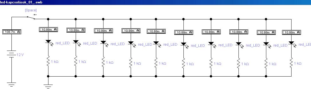 Az ampermérők az áramok eloszlását szemléltetik. LED-kapcsolások_01_.jpg