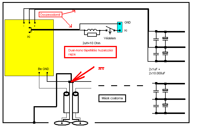 A válaszom részben kérdés is. Szerintem teljesen duál monó felépítésnél lehet a csillagpont az végfokpanel közepe (Alkotós nyákon). Itt nincs közösítve a két oldal testpontja sehol sem. Nem feltétlen szükséges, hogy a tápnál legyen a csillagpont. Vagy esetleg rosszul gondlom?