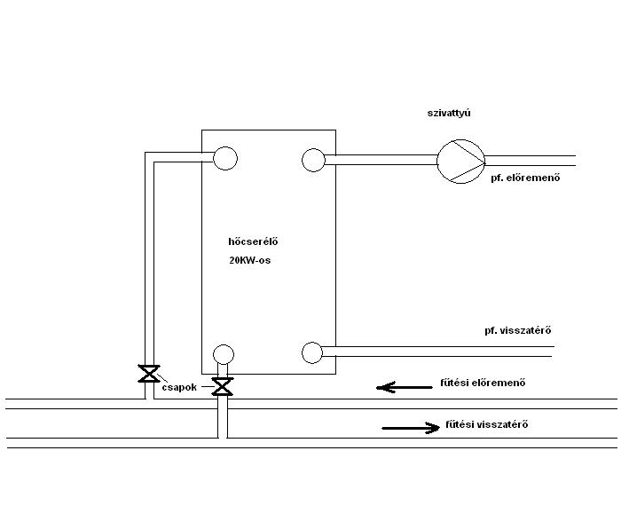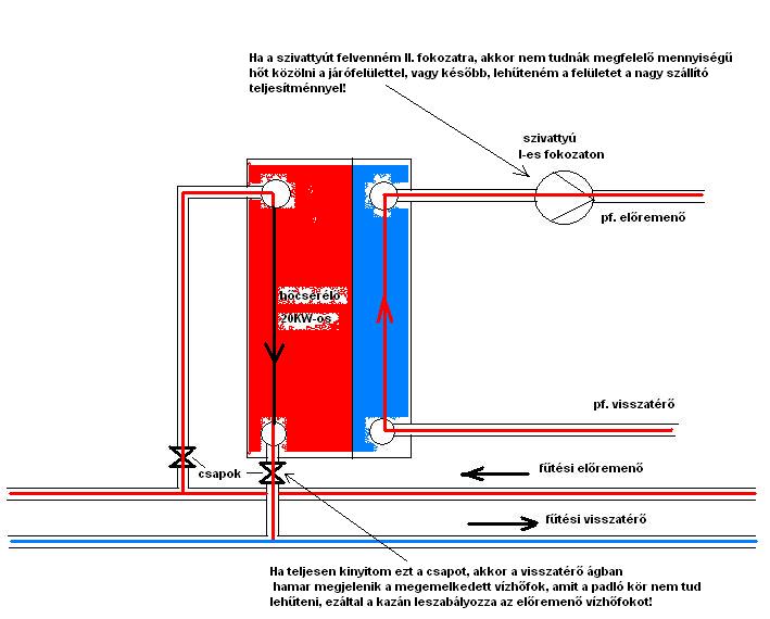 Idézet: . De nehogy kifejtsd bővebben! A mostani felállás szerint a radiátoros körrel párhuzamosan van kötve a hőcserélő primer köre. Így a hőcserélőbe akár 70fokos víz is áramolhat. Hőleadás szempontjából a keresztmetszet fojtásával lehet limitálni a fűtőközeg hőmérsékletét. A bekötése, "ellenáramoltatásos" (szembeáramoltatásos), mivel lemezes. Szekunder oldalán a szivattyú fordulata limitálja a szállítóteljesítményt és persze befolyása van a hőátadásban a hőcserélőnél is.„Vagyis ha a hőcserélő 25°C-os visszatérőből csak 40°C-os előremenőt tud készíteni,” Idézet: „Minél nagyobb a külső és a belső hőmérséklet közötti különbség annál nagyobb a hőveszteség,” Hát itt jön képbe a hőszigetelés jelentősége. Minél jobb tulajdonságúak az anyagok (hőszig. szempontból), annál kevesebb lesz a veszteség amit pótolni kell a kívánt érték fenntartásához. Ehhez kapcsolódik egy érték, amit munkapontnak neveztek el. Ez a pont határozza meg a fűtőközeg hőmérsékletét. Lehet, hogy nálam ez is ismeretlen. A 70fokos maximum helyett lehet, hogy elmenne 60-n is, csak a vezérlés...