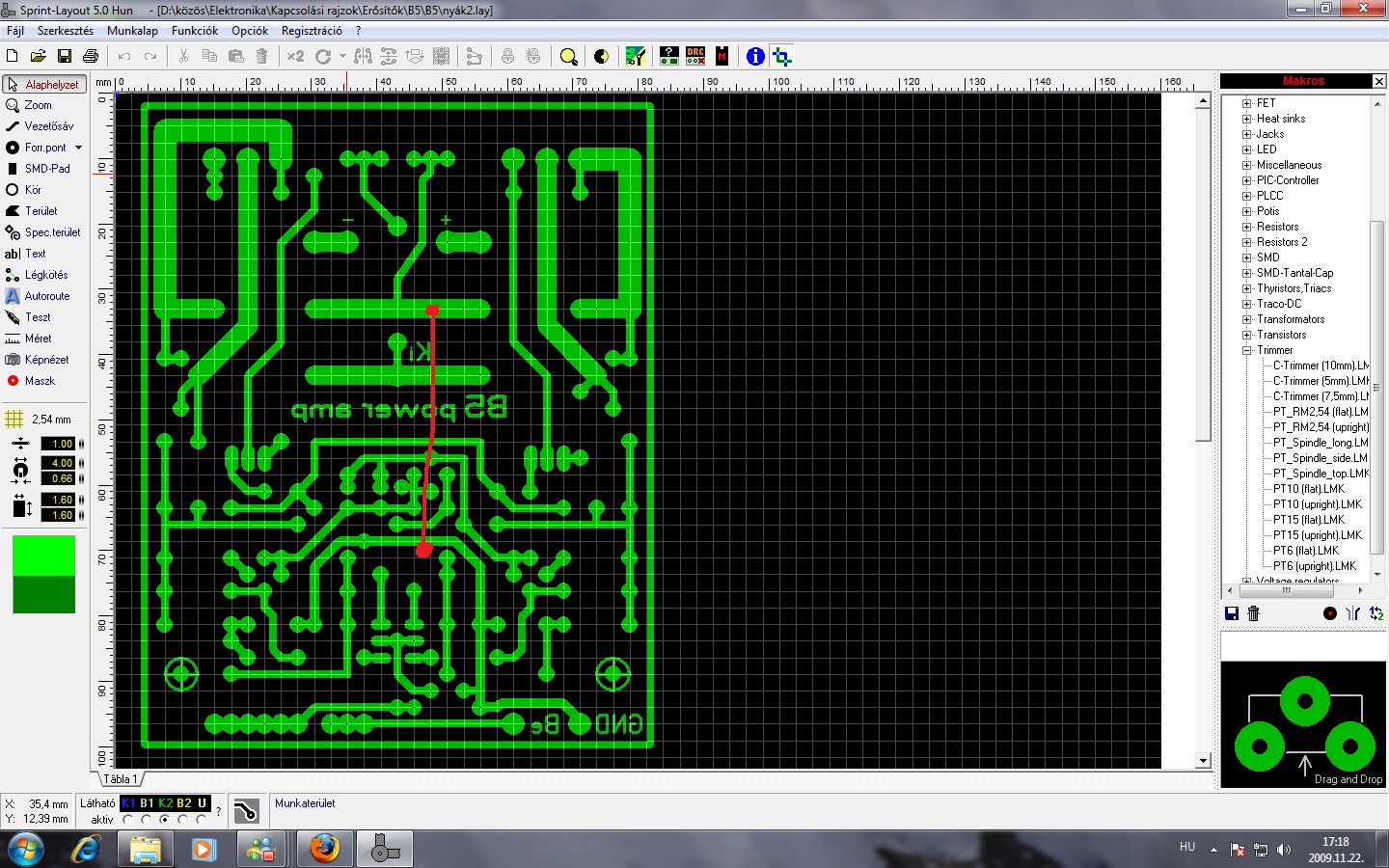 A KD mester féle nyák valóban zsúfoltra sikerült, de a kondenzátorok méretével lehet sok helyet spórolni. A 220µF-os kondenzátoroknak elég a 10V-os is. Nálam pont elfért minden: kép