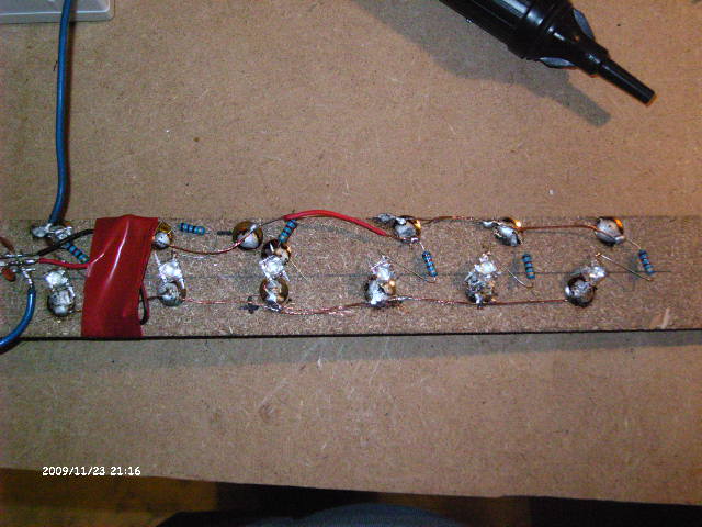 Megépítettem az UV-ledes levilágítómat. Nem volt kedvem nyákot csinálni, meg így olcsóbb is volt úgyhogy "deszkamodellnek" csináltam meg. Egy autó akkuról működtedtetem, de világíthatna erősebben is csak akkut még fel kéne tölteni. Képek: