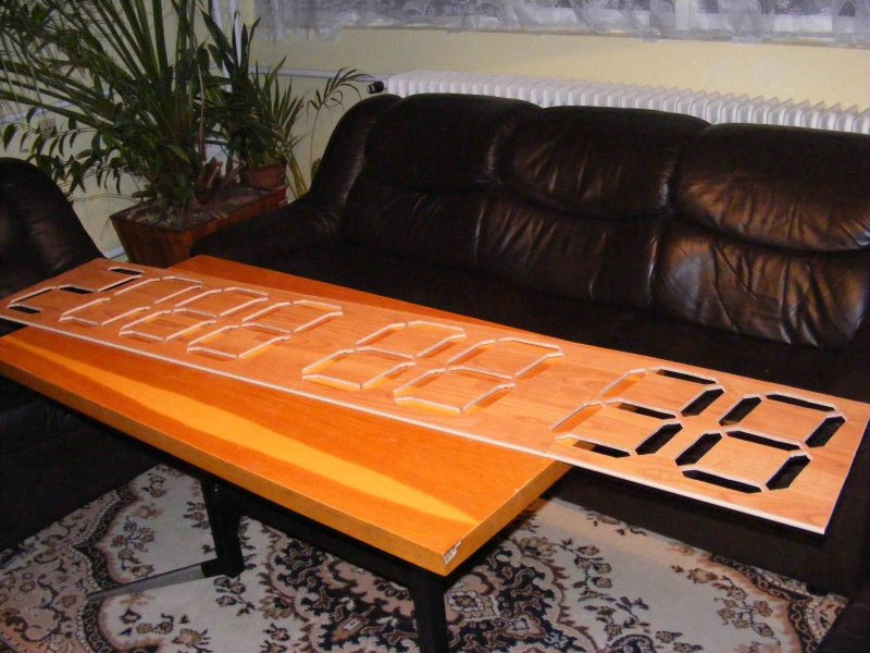 Sziasztok. Most próbáltam összeszedni a fényképeket, de "lidi" kolléga megelözött vele. Az előlapot dekopir fürésszel vágdostam ki laminált parkettából. A betűket is. Előtte A4 lapokra előrajzoltam a kijelzőt. Aztán 5mm vastag 5cm széles leceket gyártottam, a megfelelö hosszú darabocskákat faragasztóval rögzitettem. Nagyon sok munkám volt vele, de megérte. Egy PIC16F877 a lelke és DCF77 vevötől kapja az órajelet. A PIC program nem az én müvem azt "tibiiii00" kolléga alkotta. Ezuttal köszönöm neki, nélküle ez nem születhetett volna meg. Azt hiszem a képek sokmindent elárulnak, ha mégis valakinek kérdése lenne nagyon szivesen válaszolok.