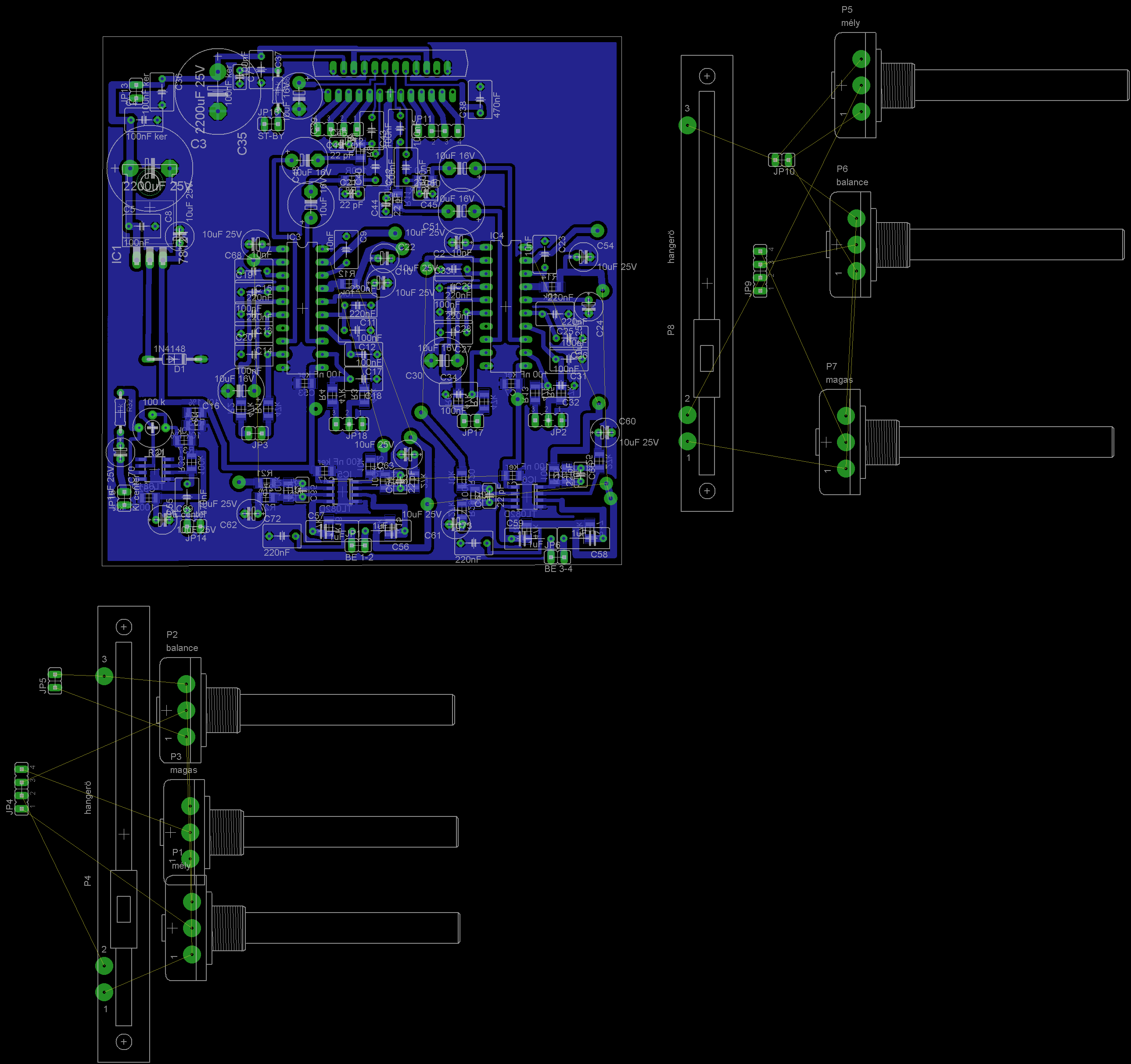 A hangszínről : Eléggé sok hibát találtam. Nem is kicsiket. A két ic referenciafesz lábát (17) ne kötsd össze ! A 17-es láb és a potikra menő feszültség közé ne tegyél ellenállást, különben a teljesen lehalkítva is fogod hallani a kimeneten a bemenetet, és zajosabb is lesz. A potikra menő feszültséget csak az egyik ic 17-es lábáról vidd oda. Csatoltam egy rajzot az szerint csináld ! Most a végfokról : Annak a négy 220n-os kondinak a műverősítők után semmi értelme, ha a dc leválasztást már megcsináltad a 1036 előtt. Szóvel elég oda csak az a 10u. Továbbá nem célszerű ennyire közel vezetni a bemenetet a kimenethez. Azokat a kondikat a végfok bemenetén (220n) ne oda tedd, valahova messzebb a kimenetektől. Ez is a zajt növeli. Mivel a kapcsolásirajzon nem ez volt, mint a panelrajzodon, így eléggé nehéz kivenni, mi hol van. A kapcsrajzot csatoltam.