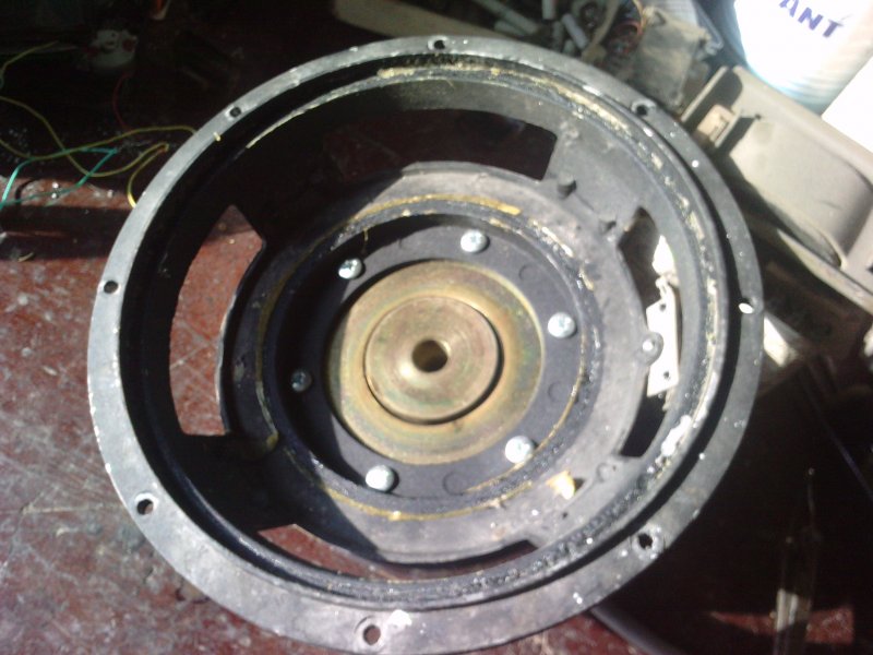A woofer-nek csak a pille-je volt elengedve a membrannal , visszaragasztottam ,egy relativ sulyos "staniol" porvedo volt a membran kozepen , muszaly volt elvagjam a ragasztas melett hogy "centralni" tudjam a hangszorot .Egy aluminium "L" profilos karika van a nagyatmeroju 100mm -es tekercstest felso vegehez rahasztva ebbe van az emlitett portalanito es sulyos portalanito ( fel tojas alaku) beraasztva.Aztan osszeallitas utan kisse "kivasaltam a kupot es visszaragasztottam.Gondolom evvel nehezebbe tettek a mozgo reszt .Aztan probaltam es meregettem nem megy lejebb 80Hz-nel ,A magnes nagy es nagyon eross igy potolja a vezsteseget.Gondoltam hogy csinaljak ketsoros tekercset de nem hiszem hogy befene a legresbe.