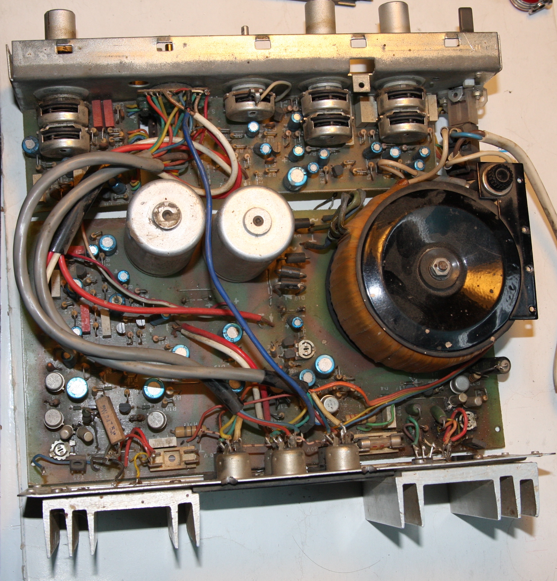A végtranzisztorok, amik jelenleg üzemelnek BD243C és BD244C, valamint van melle még egy tranzisztor, ez valószínűleg még eredeti BD139. Ennek is a hűtőn lenne a helye. A két végtranyó már cserélt.