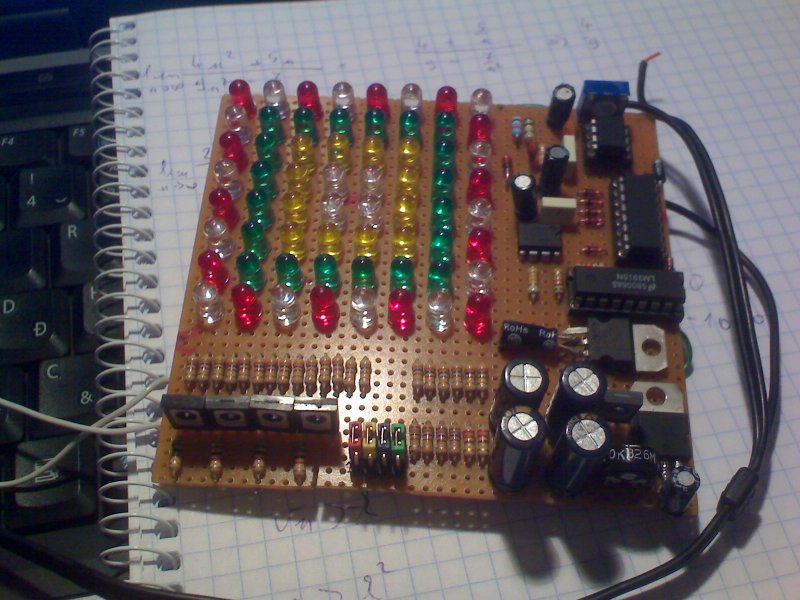 Régebben elkészült a fény-effektem. Négyzet alakban vannak a ledek elhelyezve, zene ütemére váltja a színeket. Kívülről befelé halad, ha beért, akkor kifelé. A középső ledek kékek. Egy 4017-es lépteti a színeket. Van másik üzemmódja is, LM3915 vezérli, ilyenkor sima kivezérlésjelzőként üzemel, szintén négyzet alakban. Sötét szobában tökéletesen elég ennyi led, "meghozza a hangulatot" Leírni elég nehéz a működését, majd készítek videót róla. Ez egy béta verzió, ezért próba panelre készült, ha végleges lesz, készítek normális panelt.