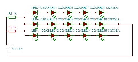 Olyan egyszerű kérdéssel fordulok hozzátok, hogy a mellékelt képen mekkora ellenállások kellenek ha egyik esetben 2,1 V-os nyitófeszültséggel számolok, másikban pedig 2,3V-ossal? A tápfeszültség 14,1V a LEDeken átfolyó áram pedig 20mA. Válaszotokat előre is köszönöm! |
