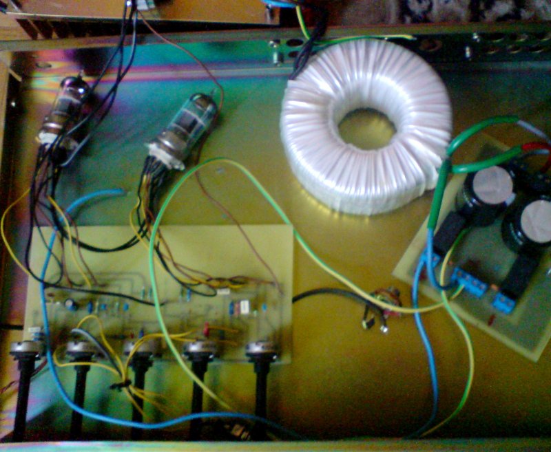 Készülő erősítőmhöz ezt építettem meg. Elég sokat tudó, szép hangú jószág. Ami nagyon kellemes még benne, hogy elmegy kis feszültségről is. Nekem a végfok +- 26V-ot kap, az anódfesz ebből lesz stabilizált 24V. A teljesen tiszta hangtól a hardrockos torzításig tud mindent, van benne booster és clean/dirty kapcsoló. A hangszínszabályzója sem a szabványos megoldás, hanem a Big Muff hangszínszabályzóján alapul. Én is meglepődtem, hogy mennyire hatékony, ha az ember egyszer megszokta.