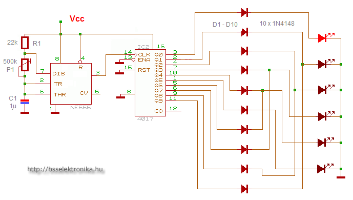 Most már jó a rajz, csak kicsit perverz.. :yes: A 12-es láb az átviteli kimenet, ha a 4017 után másikat kötnél. Azt a világért sem kell sehova kötni itt. Viszont az IC-nek tulajdonképpen van két órajel bemenete. - Ha a CLK bemenetet használod, akkor a 4017 mindig az órajel felfutó élére billen. Ilyenkor az ENA bemenetet, GND-re kell kötni (mint ahogy az eredeti rajzon is van) - Ha az ENA bemenetet használod, akkor minden órajel lefutó élére billen a számláló. Ilyenkor a CLK bemenetet VCC-re (a helyes a VDD lenne) kell kötni, hogy számolni tudjon. Szerintem Te a 13-as lábra emlékeztél. üdv! proli007
