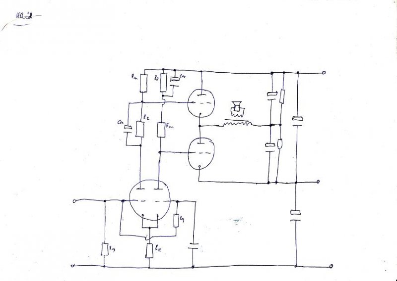 Triódás a kapcsolás, 1 Kohm-ra nem kell szűrőkondi (tilos), mert ezen keresztül feleslegesen beterhel az anódnak vezérléskor (1 K-n keresztül testelt az anód).