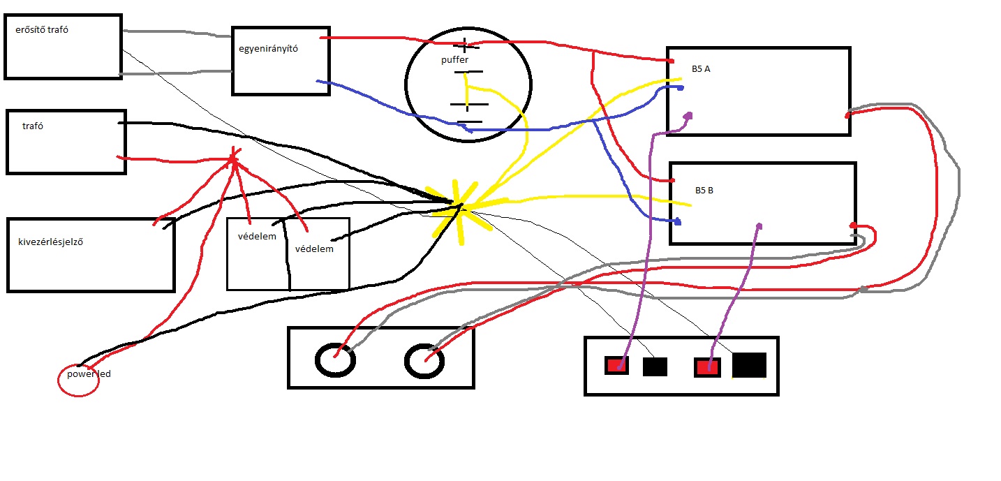 A bemeneti RCA aljzatoknál a föld részeket ne kösd rá a panel föld bemenetére, viszont kösd össze a két csatornáét, és ezt kösd rá a csillagpontra. Ollóval jelöltem, hogy mit szakíts meg, és berajzoltam, hogy hogy kösd rá a csillagpontra. A panelon össze van kötve a két föld, tehát működnie kell a dolognak. Most nálam is így van bekötve. A többi "sallangot" én egyenlőre hagynám a csudába, ha majd működik, akkor jöhet a védelem, meg az egyéb különtrafós nyalánkság.