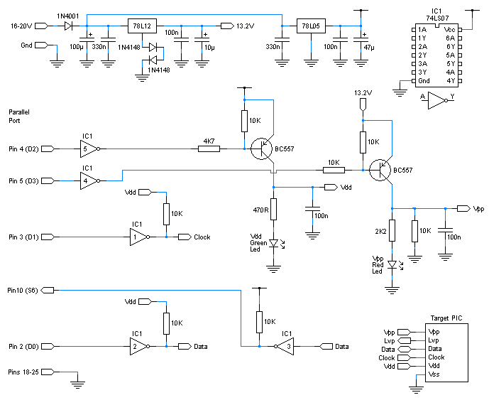 Mekkora elkó van PIC tápján a próbapanelon? Van 100n-s kondi a PIC-en a táplábához közel? Az ICSP vezetékekre csak az égető van kötve? Ha viszont nem elektromos a hiba, akkor a mai PC-k LPT portja szórakozik. A régi PC-ken nem szokott gond lenni. Én évekig haszáltam az ilyen felépítésű égetőket, a gyári Oshon, vagy a WPB_F18 égetőáramkör és még sorolhatnám, mert az összes LPT-s, ezen alapszik, soha nem volt gondom velük. Esetleg cseréld ki a 74LS04-et egy másikra, lehet, hogy sérült... Idézet: „Milyen hosszúak a vezetékek(LPT, ICSP) és miből vannak?” Az LPT-t UTP kábelből csináltam, most kb. 30 cm hosszú (többször is levágtam már belőle, hátha jó lesz). Az ICSP egyszerű szalagkábel, kb. 60 cm hosszú. Kipróbáltam úgy is, hogy kiiktattam az ICSP kábelt, és az ICSP tüskesorra egy hüvelysort dugtam, majd ezt dugtam bele a próbapanelba, de így sem működött. Idézet: „Mekkora elkó van PIC tápján a próbapanelon?” A PIC-nek a tápot az ICSP-n keresztül adom, így az csak az ICSP tápcsatlakozójánál van 100µF -os elkó az 5V -on és a 12V -on is. (bár szerintem ez is felesleges, mivel a tápot egy olyan dugasztápról veszem, amit egy USB-s IDE HDD mobilkerethez kaptam, 5V és 12V jön ki belőle 6 pólusú mini din csatlakozón keresztül). Idézet: „Van 100n-s kondi a PIC-en a táplábához közel?” A PIC táplábaihoz 470nF -os kondit tettem, mert olyat találtam. Idézet: „Az ICSP vezetékekre csak az égető van kötve?” Igen, az ICSP vezeték megy az égetőből a próbapanelre. Megvizsgáltam a PGC-t egy oszcilloszkóppal (RFT EO 211), szép négyszögjelet láttam (pedig nem valami jó ez a szkóp). WinPic by Wolfgang Buescher (DL4YHF) Pic Programmer-el is próbáltam, lelassítva az égetés sebességét, de az sem segített. PIC 16F917-et is szerettem volna programozni, de az sem ment. Kiolvasás után "PIC reading failed, maybe blank" üzenetet ír ki. A PC-m kb. 4 éves, próbáltam egy másik gépen, de azon se ment. Az IC 74LS04 vagy 74LS07?