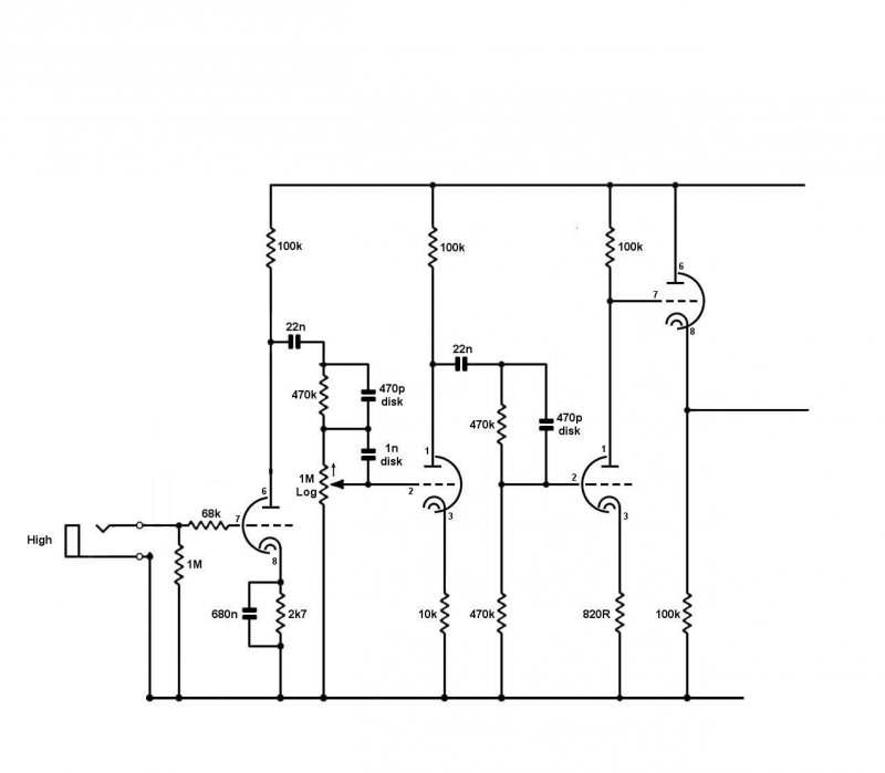Fütést itt 4-5 lábra is lehet kötni ha 12,6V vel fűtüd 12ax7 el megegyező cső! Illetve én a csőnél variálnék, mert egy overdrive részt ki lehet hozni a másik oldalábol!