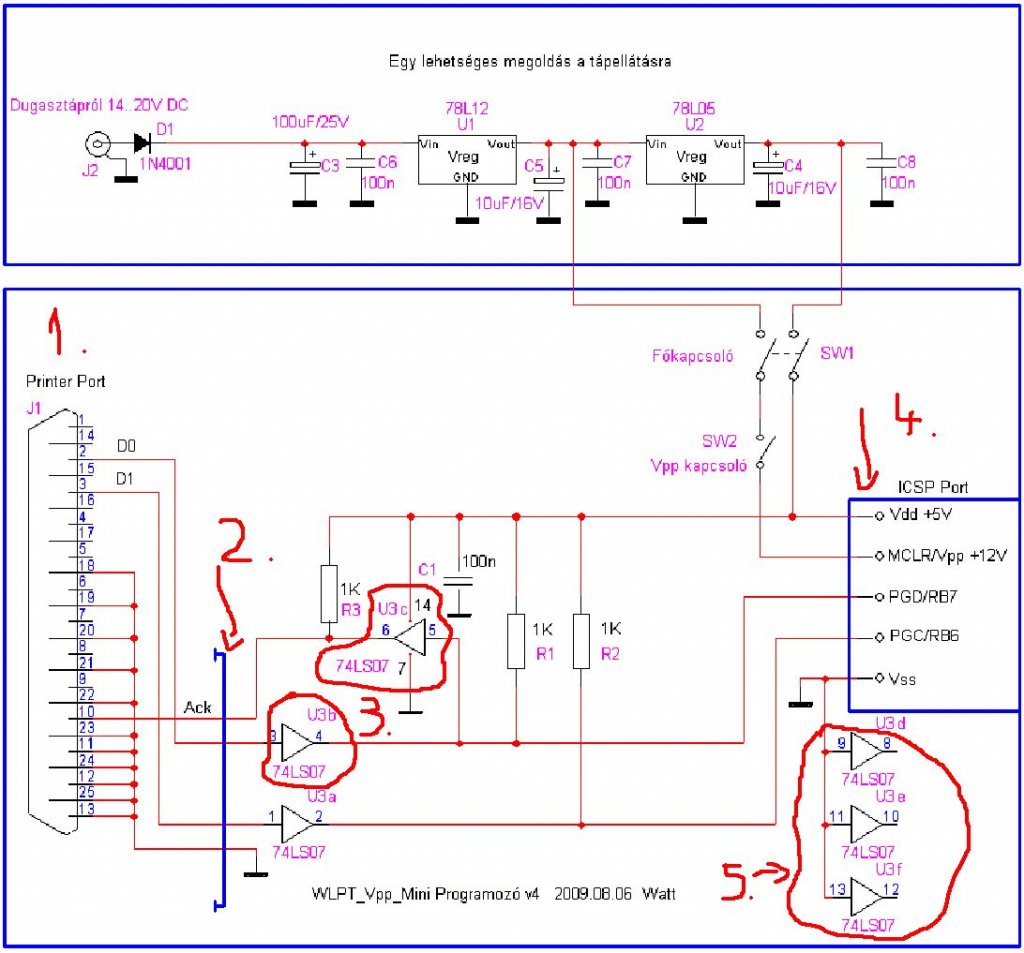 A másik kérdésem, hogy mellékelek egy képet amin a kapcsolási rajz van megszámoztam és megjelöltem azokat amikkel gondom van. Az 1.-es a nyomtatóport. Ott honnan tudom melyik az 1-es láb/vezeték? Veszek egy kábelt szerintem nincs megszámozva, bár ha mégis akkor bocs. A 2.-el jelönt kék vonal az nem tudom mi.