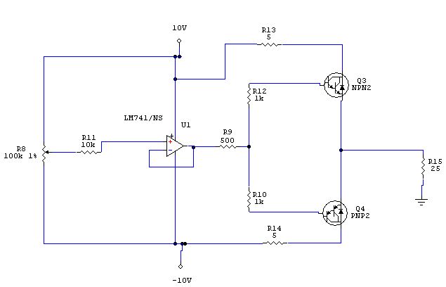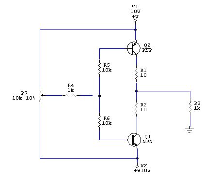 Ez amúgy sem bonyolult ÁK. Egy sima műveli erősítőt kell, meg hozzá egy kis komplementer végfok. A műveleti offszetjét beállítod arra a fesz.re ami a poti felénél van és kész. (Javítsatok ki ha nm jól gondolom, de ez így szerintem működne.)