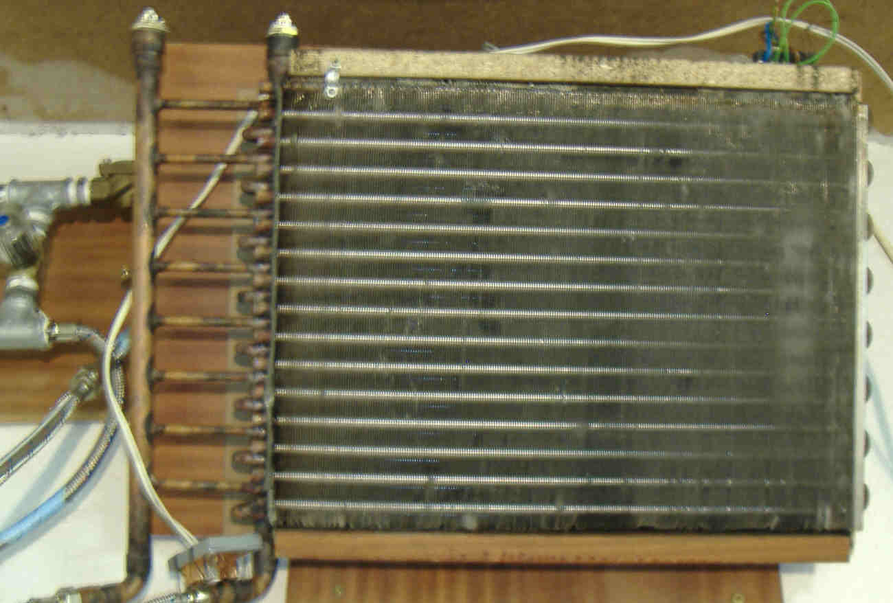 Klímaszerelőktől kértem egy rossz orosz BK2000 tipusú klíma gázkondenzátor egységet és a központi fűtésről csináltam egy leágazást neki. 4 db 12V-os ventilátor van a hátuljában. A vezérlést "összkomfortosra" csináltam ami volt itthon abból. Most próbaüzemben van és még finomítgatok a vezérlésen.