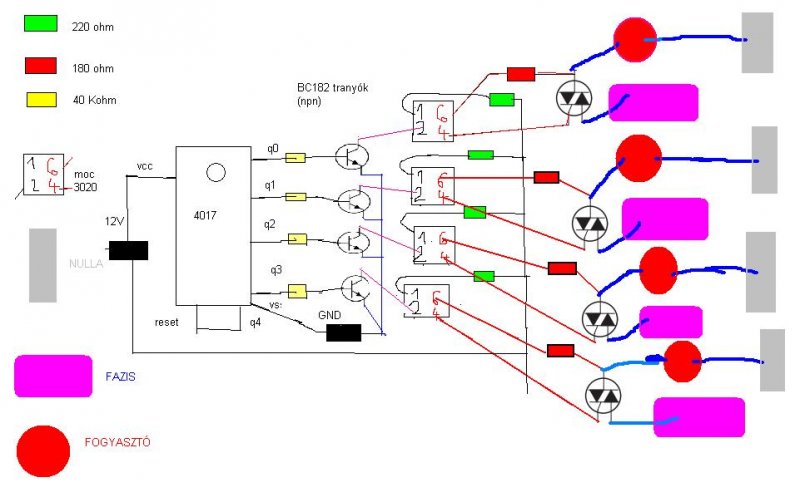 Szóval elkészült az áramköröm ami triakokkal vezérel izzókat egy 4017 segítségével, és nagyjából működik is, csak az a gondja, hogy az q1, és a q3 tehát az első és az utolsó kimenetből a triak csak kb 30V~ kapcsol. Tehát ha odakötök egy izzót akkor csak nagyon halványan világít. Szerintetek az IC-vel lehet probléma? Vagy az hogy még nincsennek hozzá izzóim, és csak 1 izzóval próbálgattam minden kimenetet? De kipróbáltam a tranzisztor collectorára meg a + tápra egy ledet kötni, és ottse mindig működött a led lillogása.