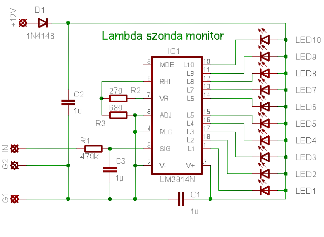 Szia. A lambdaszonda 0V-tól 1V-ig ad ki feszültséget. Ezt egy A/D-vel digitalizálja és a ledsoron kijelzi.