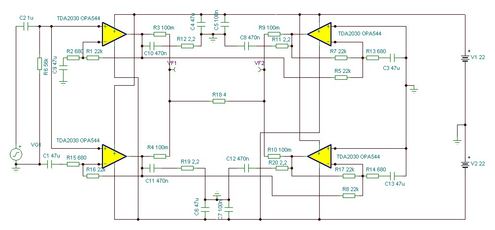 Még szerencse, hogy mindenre van megoldás, így például arra is, hogy TDA2030-al, vagy akár TL071-el 100Vpp-os vezérlő jelet állítsunk elő híd nélkül, ami után bőven elég pár emitter követőt tenni és kész a brutál végfok.