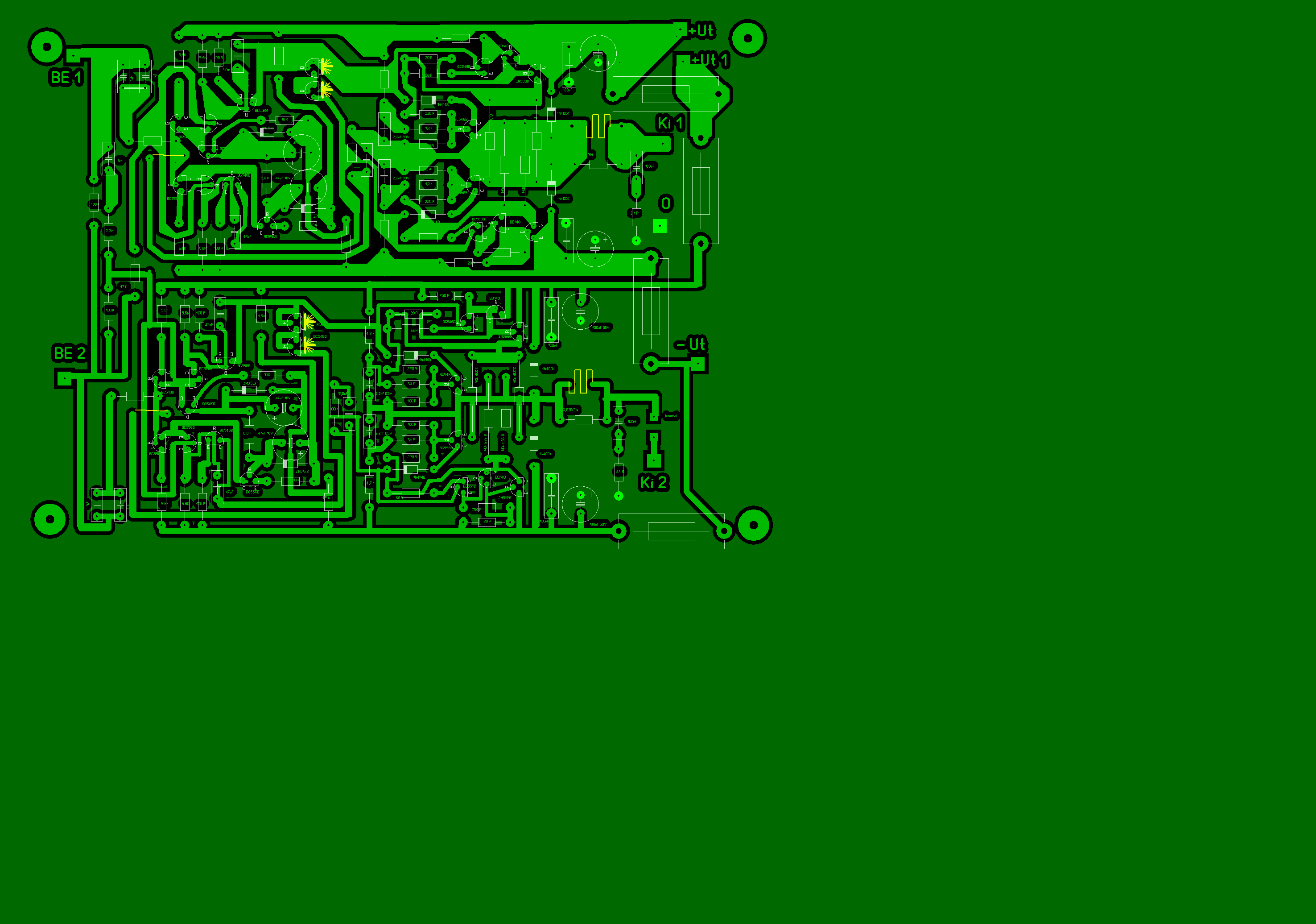 Pl itt egy erősítő panelterve, most terveztem a napokban, és még csak próbaverzió, de azért mutatja kb. miként is kéne egy ilyesminek kinéznie (szigorúan Alkotó szerint!). Persze ez csak egy lehetőség a sokféle kialakítás közük, de vélhetőleg egy jobb megközelítés mint a tiéd volt. Meríts belőle ötleteket. (Egyébként ez egy különösen rafinált kapcsolás volt nyáktervezés szempontjából, mert nagyon sok "távoli" pontot kellett összekötni benne. Vedd észre, hogy a GND-k, és a kimeneti csomópont viszonylag rendezett, nem kanyarog összevissza.)