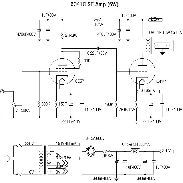 A 6N13C, 6C19P ha jól emlékszem 50 V környéki rácselőfesszel szokott menni erősítőben, úgyhogy különösebben nem kritikus a tápfesz. 250-300 V jó tápfesznek 5,6-10 K anód munkaellenállással 120-180 ohm hidegített katódellenállással 100-470 K rácslevezetővel. A belinkelt kapcsolásból egy az egyben jó lesz a 6E5P, itt olyan 230 V körül lehet a tápja. Nagyobb táp nagyobb munkaellenállás jobb lenne talán (300 V/10 K, katódban jó a 150 ohm akkor is), de én is hajtottam 6C41-et 5,6 K munkaellenállással 230 V ról, 6,2 W kijött a végén ilyen alacsony táp ellenére is.