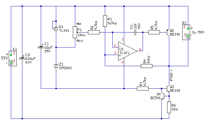 Én ilyen kis terhelésre shunt szabályzót készítenék. Rajzoltam neked egyet, ha ez megfelelő. - 0..-50V-ig szabályozható, maximális terhelése kb. 20mA - A kimenőfeszültséget kb. 50mV-ig lehet leszabályozni. Ha ez sok, akkor a PNP tranyó helyett egy N-csatornás Fet-et alkalmazva, kb. 5mV-ra lehet leszabályozni a feszültséget. - A bemenő feszültségét, 55..60V között érdemes megválasztani. - Az áramkorlát értéke fixen kb. 20mA értékű. (ezt minden esetben a végranyók elfűtik, így 60V-ról, kb. 1,2W hő keletkezik. A két végranzisztort kis hűtőfelületre lehet rakni, egymástól elszigetelni nem kell. (De a készülékháztól érdemes, mert egyben ez a negatív kimeneti pont is.) üdv! proli007