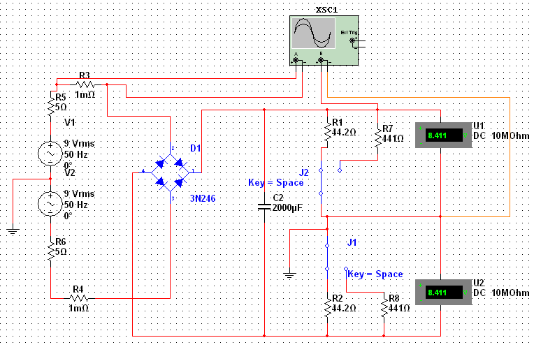 PC hangkártya szkóp programhoz szeretnék műveleti erősítős előtétáramkört készíteni és ennek a szimmetrikus tápegységének a méretezéséhez kérnék segítséget. A problémám abból adódik, hogy a stabilizált feszültséget maximalizálni szeretném, és a határok feszegetése miatt az elméleti alapok pontosabb megismerése is fontossá vált. Van egy 2x110/2*9 V, 7VA-es Puskás trafóm, és e mögé raknák egy feszültségstabilizátort. Egyrészt megmértem a szekunder tekercsek ellenállását, ami tekercsenként kb 5 ohm-nak adódott. Másrészt kiszámoltam, hogy Imax(AC)=7VA/18V=0,388 A oldalanként. Ez viszont még a 220V-os korszak állapota, amiből következik az első elméleti kérdésem: 230V-ra áttérve a kivehető teljesítménye nőt ezzel arányosan, vagy a kivehető árama csökkent? Gyakorlatban nyilván biztonságra fogok törekedni, ezért biztos bőven az elvi maximum alatt fogom csak terhelni. Egyenirányítás után elvben U=sqrt(2)*9=12.7V, így Imax(DC)=7VA/25.4V=0.275A oldalanként. Biztosra menve ezért úgy szeretném belőni a rendszert, hogy a stabilizátor és ami mögötte van 0.2A tartós terhelésig nyugodtan elmehessen. Ez kb 5W. Elkezdtem a Multisimben kísérletezni, és Deguss cikkéhez nagyon hasonló áramkőrt építettem fel. Terhelésnek oldalanként 44.2 ohm-os ellenállásokat (ez volt a virtuális polcon ) raktam, ami a 7W-os terhelést utánozta, hogy lássam hogyan alakulnak a dolgok. A kapcsolásban a trafót két AC feszültség generátorral helyettesítettem. A pufferkondik üresben felmentek 11.7V-ig ill terhelve megjelent rajtuk valamennyi brumm. Ez eddig OK, de amíg a szimulációban egy ideális feszültség forrás dübörög, addig itt kint egy elég vérszegény trafócska fog erőlködni. Ezt úgy próbáltam kompenzálni, hogy a trafó szekunder tekercsein mért ohmos ellenállást is beépítettem és megnéztem, hogy akkor mi történik. A hatás elég durva, a brumm akár 8.2V-ig is leviheti a pillanatnyi feszültséget, ami a stabilizátor működését is jelentősen behatárolja. Emellett, ha ez nem lenne elég a így a terhelő ellenállás 8.4V középfeszültség mellett csak 1.6 W-ot vesz fel, ami fele az ideális feszültségforrásnál mérthez képest.Itt vagyok most elakadva, mert bár kísérletezhetnék az igazi trafóval amellett, hogy a 220-al nem szívesen játszom, multiméterrel a jelalakot úgysem látom. Ezért kérem a segítségeteket, hogy egyrészt elméleti síkon is fejlődjek, illetve a konkrét problémára is megoldást találjak. A meghajtott áramkör két csatornát fog kezelni, amit 1 db ne5532 elintéz, illetve egy mini jelgenerátor lesz még benne, amiben az egyetlen aktív elem egy 4011. Összefoglalva a kérdéseim: 1, A 220V-ról 230V-ra átállás hogyan befolyásolta a trafók kimenő paramétereit terhelhetőség szempontjából? 2, A szimulált kapcsolási rajzban helyesen helyettesítettem-e a trafó szekunder oldalát? Ha nem hogyan kellett volna? 3, Ha a terveim szerint DC 200mA folyamatos terhelésnek megfelelő áramot (kb 5W) szeretnék biztosítani a stabilizátoroknak, és ehhez szeretném megtalálni azt a maximális feszültséget amit a stabilizátor kimenetén biztosan tarthatok, akkor milyen módszert javasoltok? (Lehet, hogy félig sem lesz kihasználva az a 200mA, de mondjuk induljunk el ebből.) Feszültség stabilizátor IC, Zener, valami más? 4, Deguss kapcsolásához képest én csak egy pufferkondit raktam, a 0V-ot a trafótól vezetem csak el. Van-e minőségi különbség a két illetve az egy puffer kondenzátoros megoldás között? Pl trafó miatti zajozás, meg ilyenek. 5, A Puskás trafót többet hallottam szidni, mint dicsérni. Van valami alapja? Ha igen lehet rajta kívülről segíteni? Ha valamilyen konkrét mérést el kellene végezni a számolgatáshoz, akkor írjátok meg, megpróbálom elvégezni. Ha kell tudom hajtani a 230V-ról, illetve van 2*10 és 2*20 V AC-m amit kedvemre kuszálhatok. Digitális multimétereim vannak a méréshez. Megj.: A Graetzet csak úgy hasraütésszerüen választottam, mivel még nem ismertem ki magam annyira a programban, hogy az adatlapjából kiderítsem mit is tud. A 441 ohm csak a pufferkondi gyorsabb feltöltése miatt került bele. A képeken egy már állandósult állapot látszik, a szkóp képén az "egyenes" (Channel B) a pufferkondi feszültsége, a "huplik" (Channel A) pedig kondi töltőáramával arányos jelet mutatják. A trigger a töltés megkezdésére van állítva, T1 (kék marker) a töltés kezdetére jellemző állapotot mutatja (UCmin), a T2 (sárga marker) pedig a töltés végén létrejövő értékeket (UCmax) Üdv: Rascal