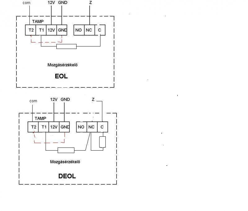 Igen, jól értetted... Neked csak a t1, t2 Nc és C kell. Mondjuk: Z1-től vezeték t2-be, t1-ből ellenállás c-be, innen a c-ből még egy ellenállás nc-be és nc-ből szintén vezeték a paneli com-ra. Tehát t2-be egy vezeték, t1-be egy ellenállás egyik lába, a másik lába az ellenállásnak közösen a másik ellenállás lábával a c-be és a második ellenállás másik lába az nc-be a második szállal együtt a központ felé... Az EOL nem kell.