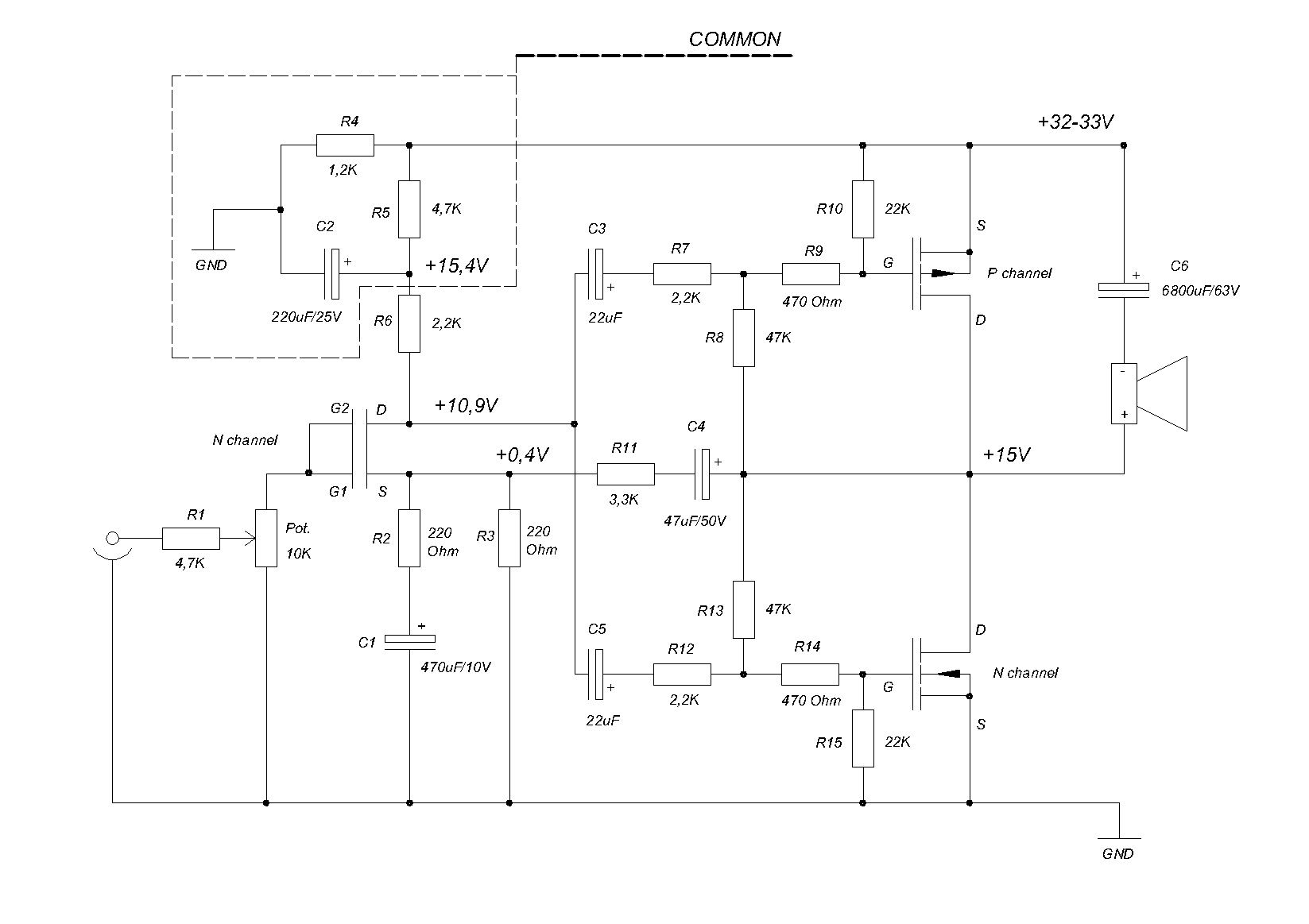 Szevasztok.Oszeraktam ezt az erositot,es mukodik szepen csak az a problemam hogy alapjaratba van egy kis bugasa,ami nagyon zavaro.Az alimentalast az jol megcsinaltam,tetem neki egy 300W-os trafot egy 32A-es graetz hidat,meg ket darab 10000mikros kondit.Foleg akor bug a legjoban mikor bealitom neki a 2.7A-nyugalmi aramot,ugyanis enyit ir elo a raj.A vegfok egyebken+-30V-rol muxik.A parameterei angolul van amit csak nadjabol ertek:Secondary Voltage(Vrms)=30,Supply Rail Voltage(V)=33,Quiesccent Current (A)=2.7,Power 8ohm(W)=60,Power 6ohm(W)=45,Power 4ohm(W)=30.Ha valaki tud angolul,vagy megcsinalta mar ezt a veget irja le nekem ide hogy mit is jelentenek pontosan ezek a parameterek,ja es a velemenyet.Ja es meg valami,a rajzon az R13,R14,R15,R16-os ellenalasok mijen ertekuek kell hogy legyenek pontosan,en ugyanis 0.1ohmos ellenalasokat alkalmaztam oda,a rajzon pedig 100m-el vannak bejelolve.Meg valami:hamikor bealitom a vegnek a 2.7A-es nyugalmi aramot a kozepfeszutseg viszacsoken egy par voltal a plusz agba,de visza tudom alitani a VR1-es(2k)trimerel,ezs normalis igy?.