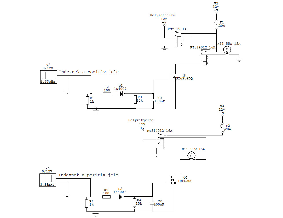 Elkészítettem és leszímúlálltam egy "elvileg" működőképes kanyarfény kapcsolást. Működése: Az adott oldali indexről kapja a kb. fél másodperces pozitív jelet, majd ezután a tranzisztor nyit, és kb. 4másodpercig zárja a relét (r3-al változtatható az idő), és így világít az adott oldali ködfényszóró, majd lekapcsol. Kérdésként szeretném feltenni, hogy hogyan lehetne kiegészíteni a kapcsolást, hogy: 1- Ha felkapcsolom a ködfényszórót, és a kanyarfény is áramot ad, ne sűljön le az egész. 2- Van arra megoldás, mint a mercikbe, hogy ha letelik a 4 másodperc ne egyből kapcsoljon le, hanem szépen elaludjon a lámpa, gondolom ez nem relés megoldás, hanem akkor? Előre is köszönöm a segítséget