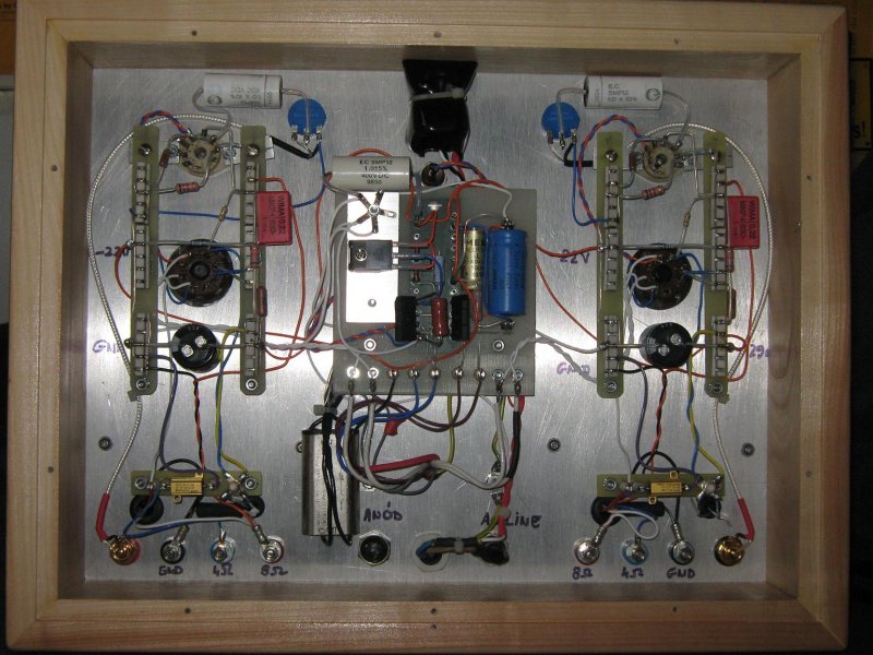 Akkor tessék, nehogy kilyukadjon az oldalad! Köszönöm az építő jellegű kritikát, de sajnos abból kellett dolgoznom, ami itthon beszerezhető volt. A kapcsoló Japán, habár kivitelre ugyanolyan mint a kinai gagyik.A gombok a Farnell-tól vannak, ez volt még a legnormálisabb. Volt akinek a visszajelző izzó nem tetszett, de hogy nézne ki egy csöves erősítő leddel? Na mindegy , a következő már jobb és szebb lesz! Üdv!