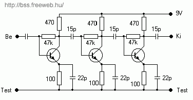 „Az erősítő a 6...12-es tv-csatornákat erősíti legjobban. Kimenete és bemenete 75 Ohmos koax-hoz illeszkedik. A lehetséges tranyók bekötését mellékeltem. Ajánlatos mindhárom tranyót egyformára választani. Vigyázat!! A BF479 és BF679 pnp! Ekkor meg kell fordítani a tápfeszültséget!”