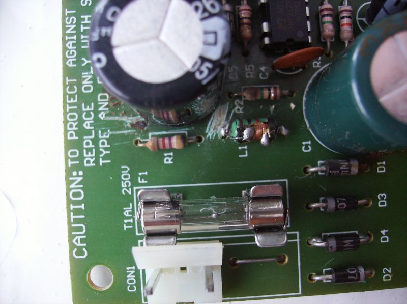 Az ,ami a képen csunya (többek között) egy kis tekercsnek néz ki.Mérj rá egy multiméterrel,hogy nem szakadt-e, ha az utánna lévő kondin nincs feszültség,akkor ellenőrizned kell ezt is és a diódákat is.