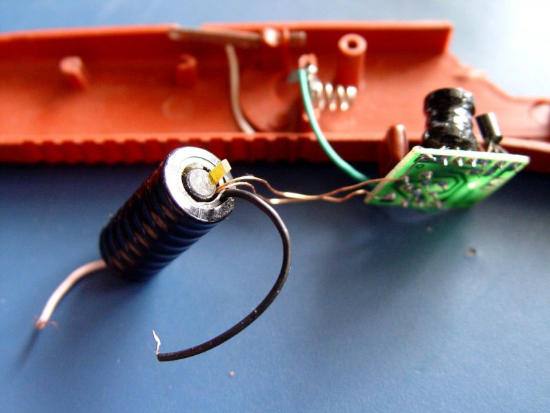 A nyákon van egy ferritmagos trafó az oszcillátorhoz, a nagy fekete alkatrész az osztott tekercstestes nagyfesztrafó, a pár menetes lakkszigetelésű prímer vezeték a kb. 5 mm-es átmérőjű ferritrúd magra van tekerve, és az így van a tekercstestbe bedugva, egy rögzítő gumiszalaggal.