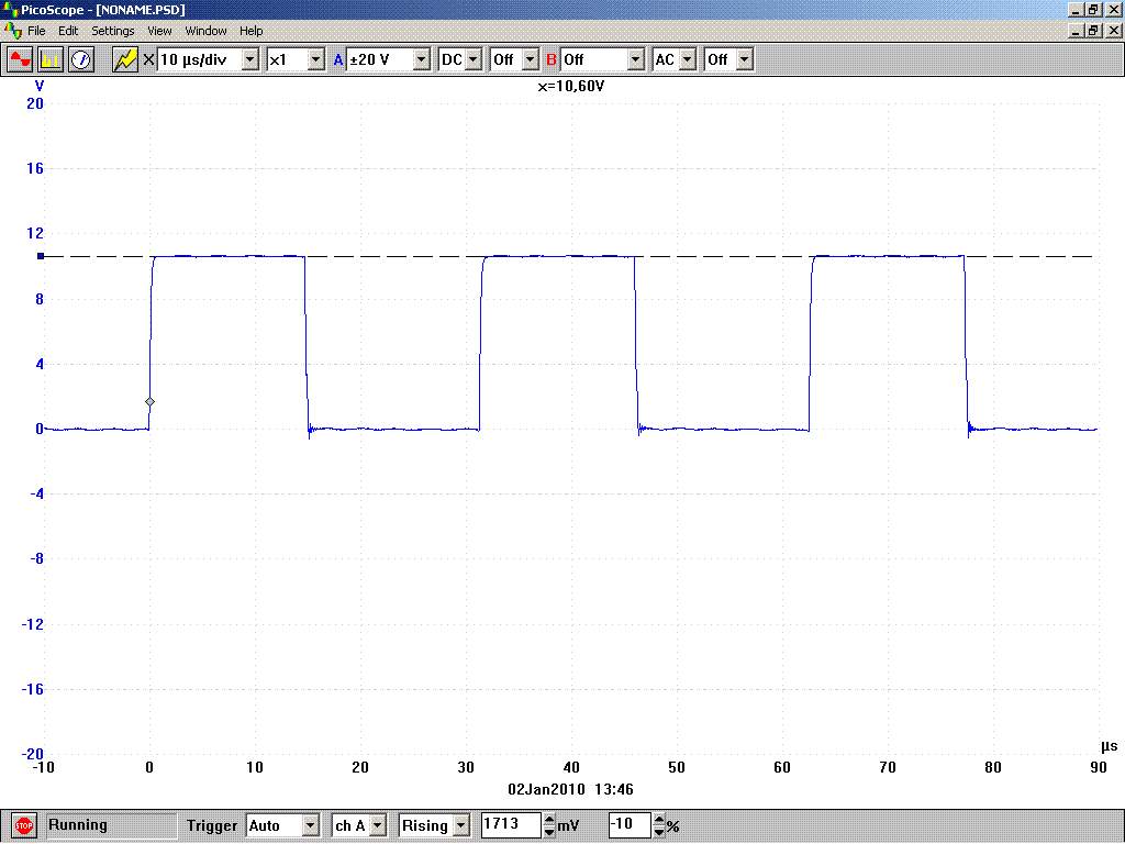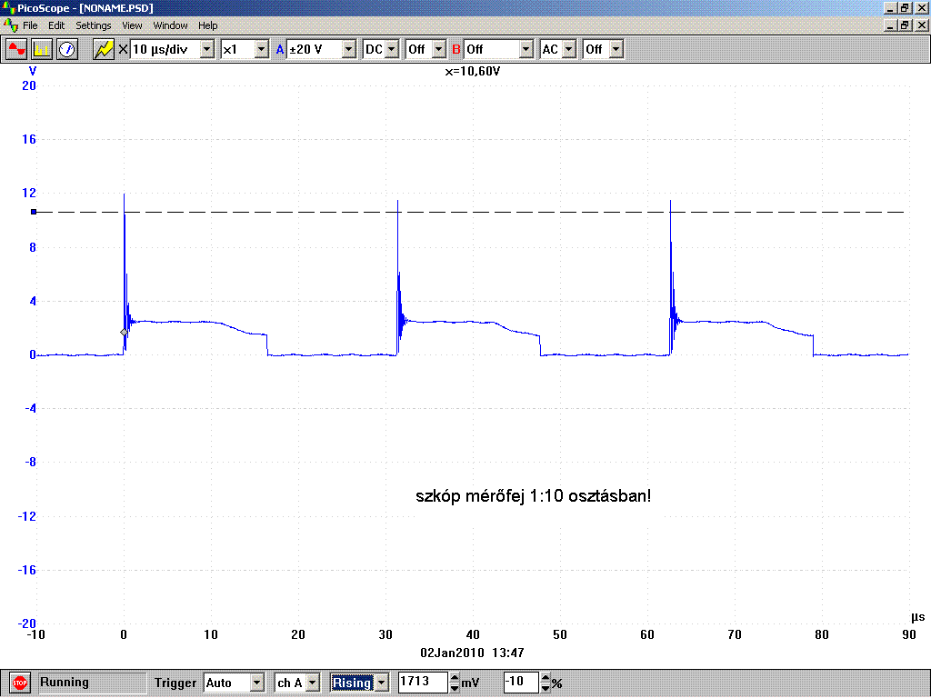 A képeknél valamelyikek 1:1-es (zeneren mért képek), mások 1:10-es (impulzustafósak) osztással készültek, a "ketyere" életének érdekében. Ha jól tudom ez a Picoscope csak max 20V-ot visel el a bemenetén.