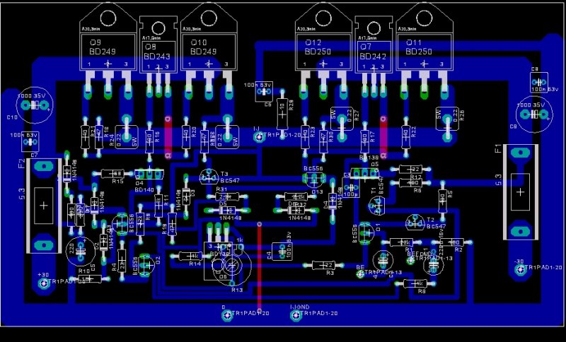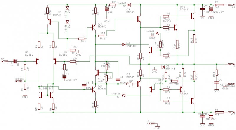 Nem tud valaki egy kapcsolást nekem BD249 és BD250 -es tranyókból csak ez a 2 tranyó legyen mert ismerem a TDA 2030-as kibővítettet de nekem csak a "tranyós" végfok kéne. esetleg ebből visszafejteni(kép)
